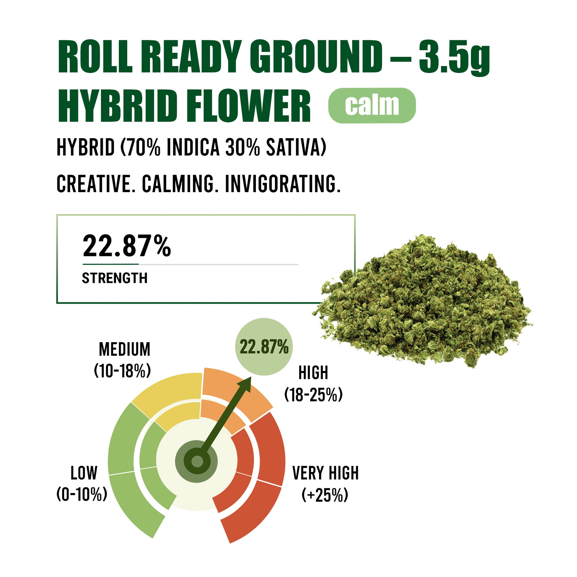 Premium pre-ground flower—convenient, potent, and ready to roll. No grinder? No problem. Our Roll Ready Ground is a high-quality hybrid strain, freshly ground and packaged in a resealable pouch for easy use. Each 3.5g bag provides enough flower for approximately 4 joints, making it perfect for fast sessions or rolling on the go. Crafted for consumers who want top-shelf flower without the extra prep, this ready-to-use format saves time while delivering a smooth, flavorful, consistent, burn every time. Premium quality at an accessible price! No trim, No Shake, Just quality bud.